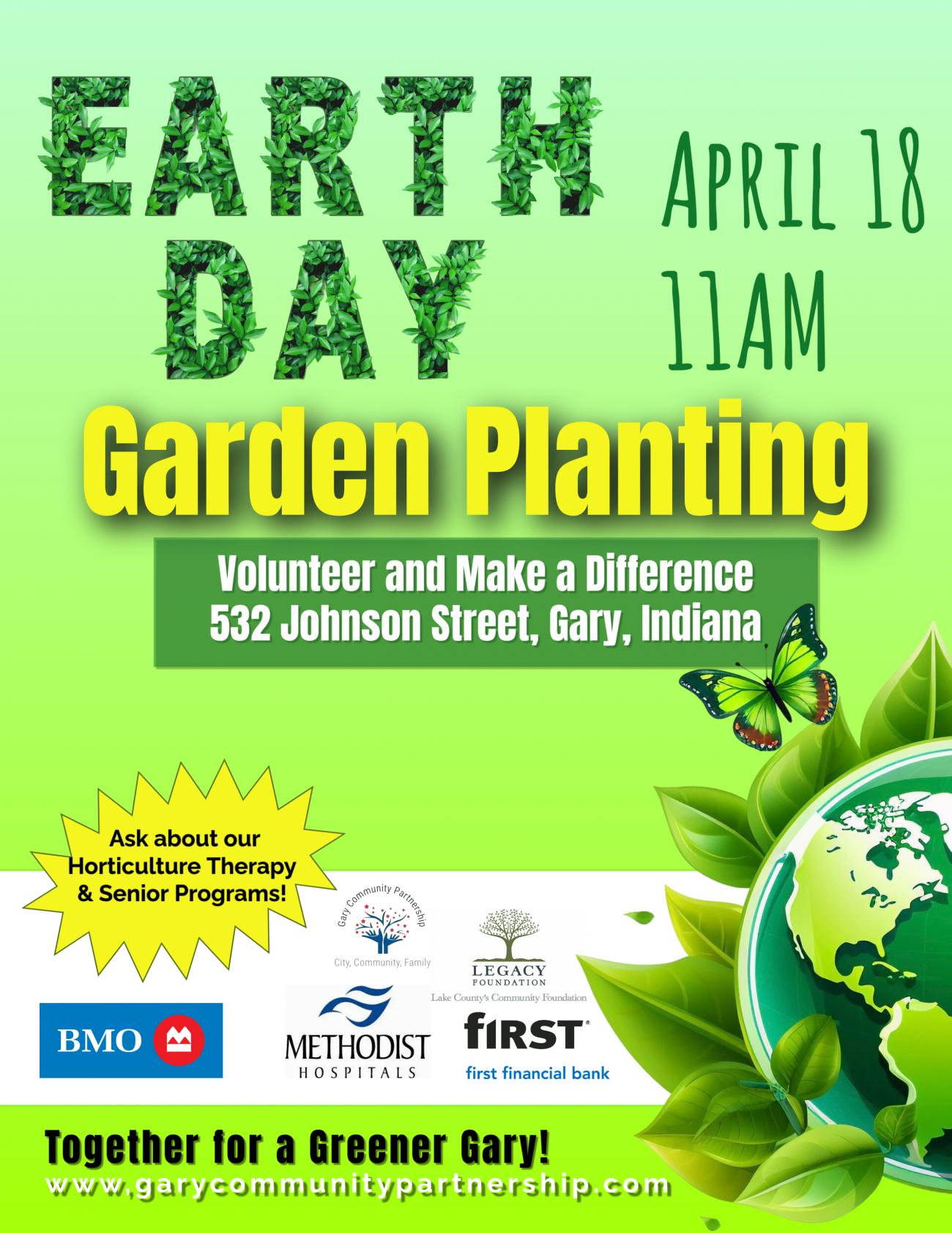Gary, IN – Clean Earth Champions Gary Community Partnership will celebrate Earth Day focusing on Community, Connection, and Care for the planet! The nonprofit's annual observance brings together volunteers, families, and neighborhood residents in a common call to clean-up the organization’s newly designed Horticulture Therapeutic Garden located at 532 Johnson Street in Gary. The event will take place Saturday,