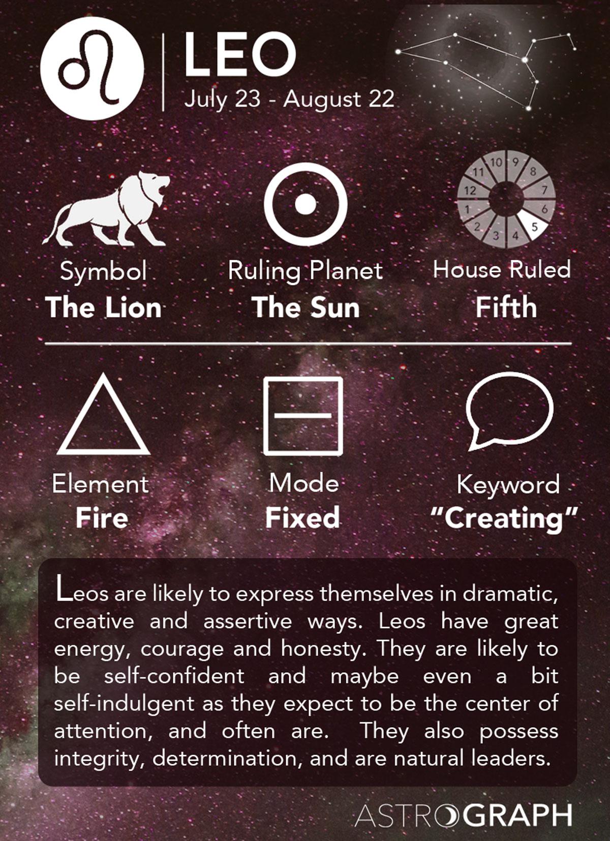 Dates July 23rd-August 22nd Element: Fire Polarity: Positive Quality: Fixed Ruling Planet: Sun Ruling House: Fifth Spirit Color: Gold Lucky Gem: Carnelian Flower: Sunflower & marigold Top Love Matches: Libra Leo, the fifth sign in the zodiac, belongs to those born between the dates of July 23rd and August 22nd. Learn all about the Leo sign below. Leo Zodiac Sign Traits Bold, intelligent, warm, and courageous, fire sign Leo is a natural leader of the Zodiac, ready to blaze a trail, vanquish injustice, and make a name for themselves along the way. Blessed with high self-esteem, Lions know that they possess enviable traits—and they're proud of them. They don't believe in false modesty and will be the first to praise themselves for a job well done. But Leo isn't self-aggrandizing or unwilling to roll up those sleeves and do the work: this sign knows that in order to be respected and admired, he or she needs to put in the effort worthy of a leader.