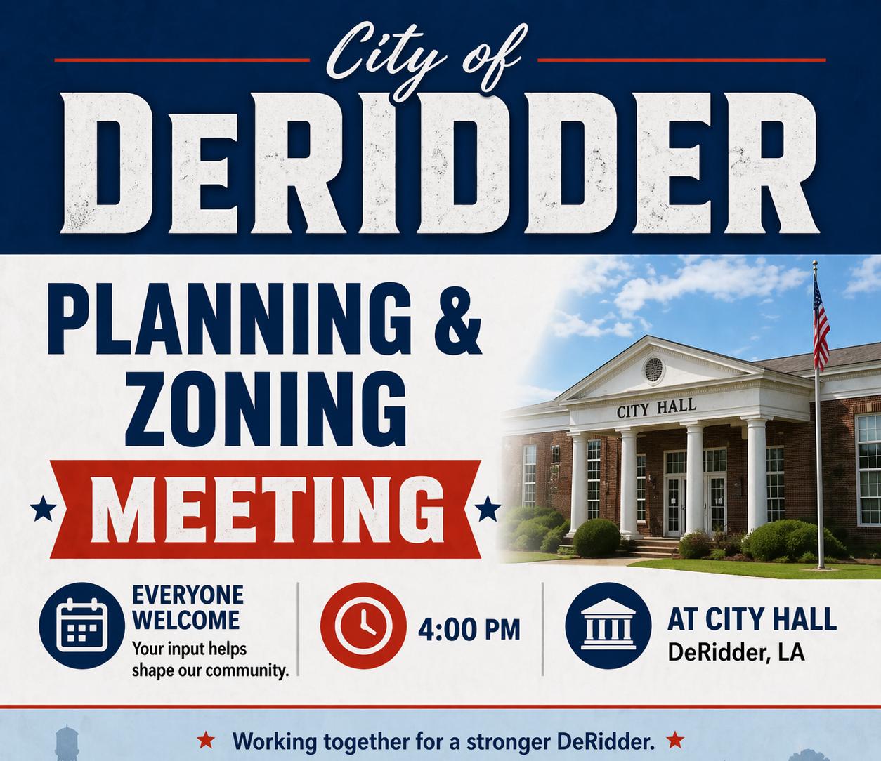 The City of DeRidder Planning & Zoning Meeting will be held at 4:00 PM at City Hall. This is your opportunity to hear updates, learn about upcoming developments, and be part of important conversations that help shape our city.