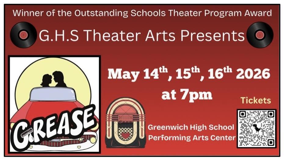 Greenwich High School's Theater Arts program presents the beloved, high-energy musical "Grease" over three nights in the Performing Arts Center. Bring your family to follow Danny and Sandy's story. Enjoy such hits as "Greased Lightnin'" and "We Go Together" sung by our high school's best voices and performed with a live orchestra.