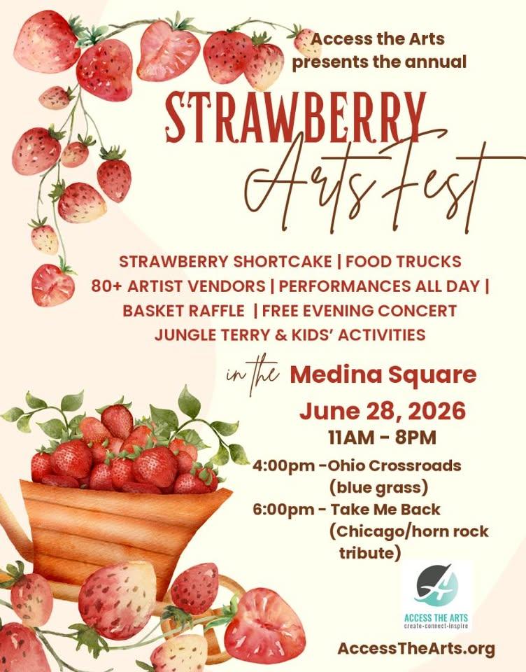 Join us for the annual Strawberry Arts Fest hosted by Access the Arts in the Medina Square - A music and art festival including over 80 art vendors, food trucks, children's activities, including performances from Jungle Terry, local vocal and dance studios, Ohio Crossroads Bluegrass Band at 4pm and Take Me Back, Chicago and Horn Rock Tribute Band at 6pm. And of course strawberry shortcake and sundaes as long as supplies last!