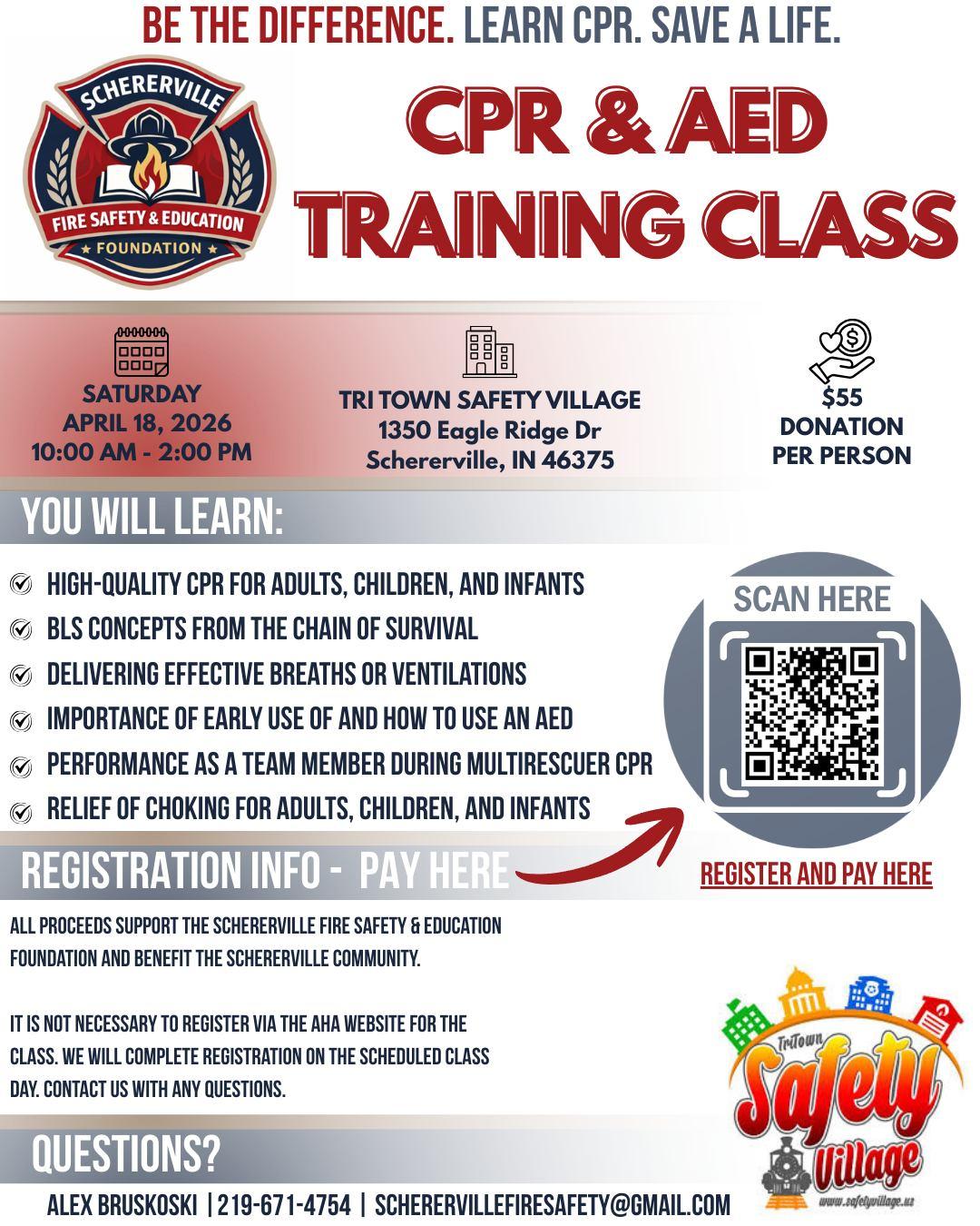The Schererville Fire Safety & Education Foundation is hosting a CPR & AED Training Class for community members who want to learn how to respond in a life-threatening emergency.