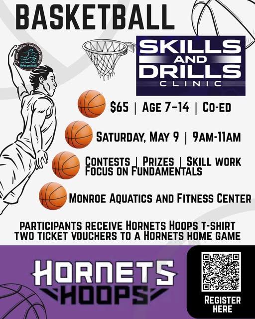 Kids ages 7-14 can join Hornets Hoops for an action-packed Skills & Drills clinic on Saturday, May 9 from 9 am - 11:30 am. The cost is only $65 for members and the public.
