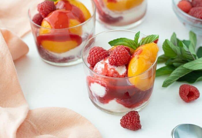 To serve, for each serving place a large scoop of ice cream in a sherbet glass. Place two peach halves on top, then drizzle with raspberry sauce.
