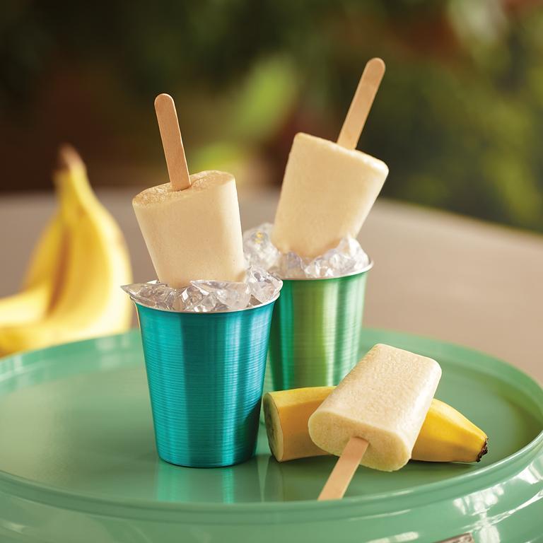2 SPOON banana mixture into 8 (5-ounce) paper cups. Freeze 30 minutes. Insert wooden craft stick into the center of each cup; freeze until firm, about 2 hours.