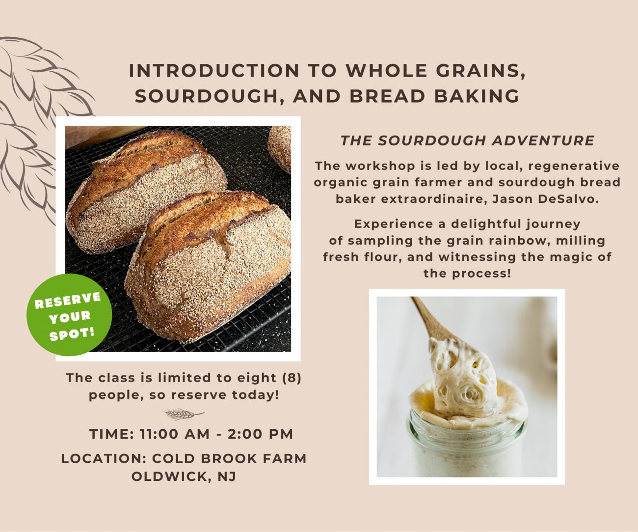 Join us at Cold Brook Farm for The Sourdough Adventure - an intimate, hands-on workshop led by local regenerative grain farmer and sourdough baker Jason DeSalvo. Explore whole grains, mill fresh flour, and experience the magic of traditional bread baking in a beautiful farm setting.
