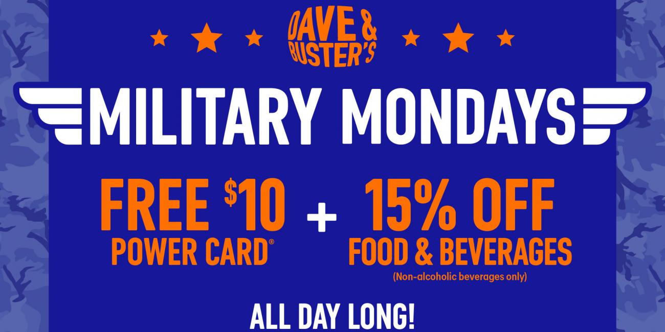 At ease — it's time for fun! Every Monday, Dave & Buster's is hooking up ALL vets & active-duty military members with a FREE $10 Power Card + 15% off food and non-alcoholic beverages with valid military ID.