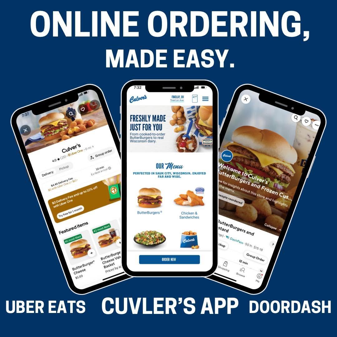📲ONLINE ORDERING is EASY through the Culver's app Click for Details , Doordash Click for Details , or Uber Eats Click for Details !