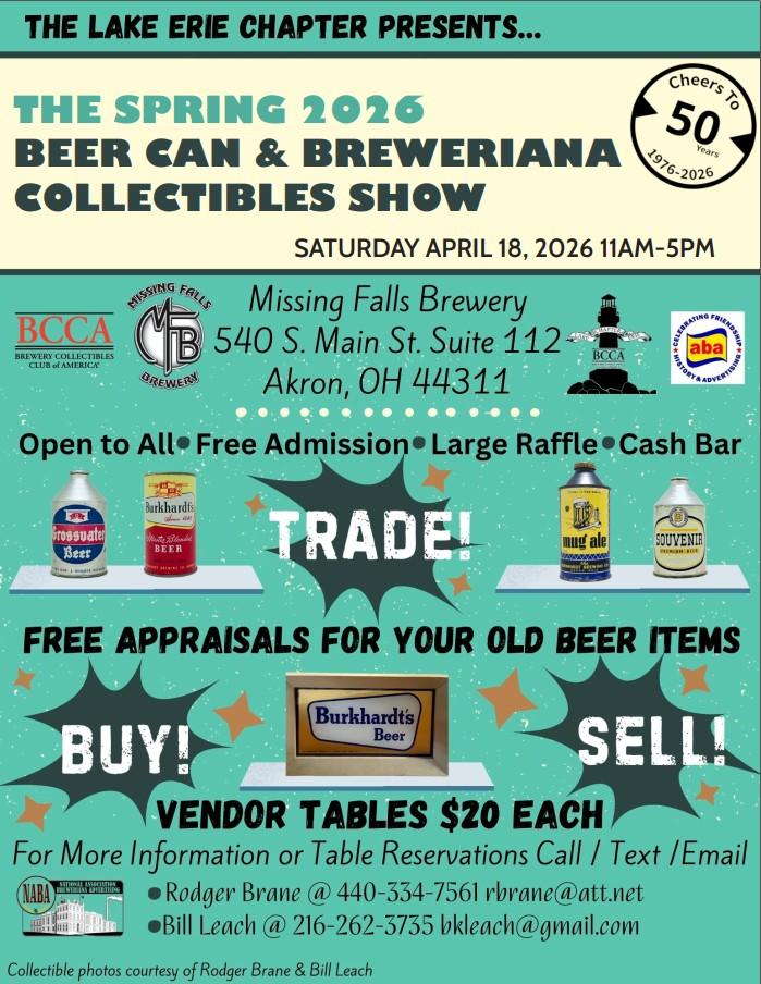 Experience the traveling beer and brewery history museum: cans, bottles, trays, signs, coasters, lights and more. Buy, Sell, Trade, Free Appraisals for your beer items! There will be 50+ vendor tables, a large raffle, and food and beverages available for purchase. All are welcome. Free admission. Questions or table reservations: contact Rodger at (440) 334-7561 or Bill at (216) 262-3735. Sponsored by the Lake Erie Chapter of the BCCA, NABA, and ABA.
