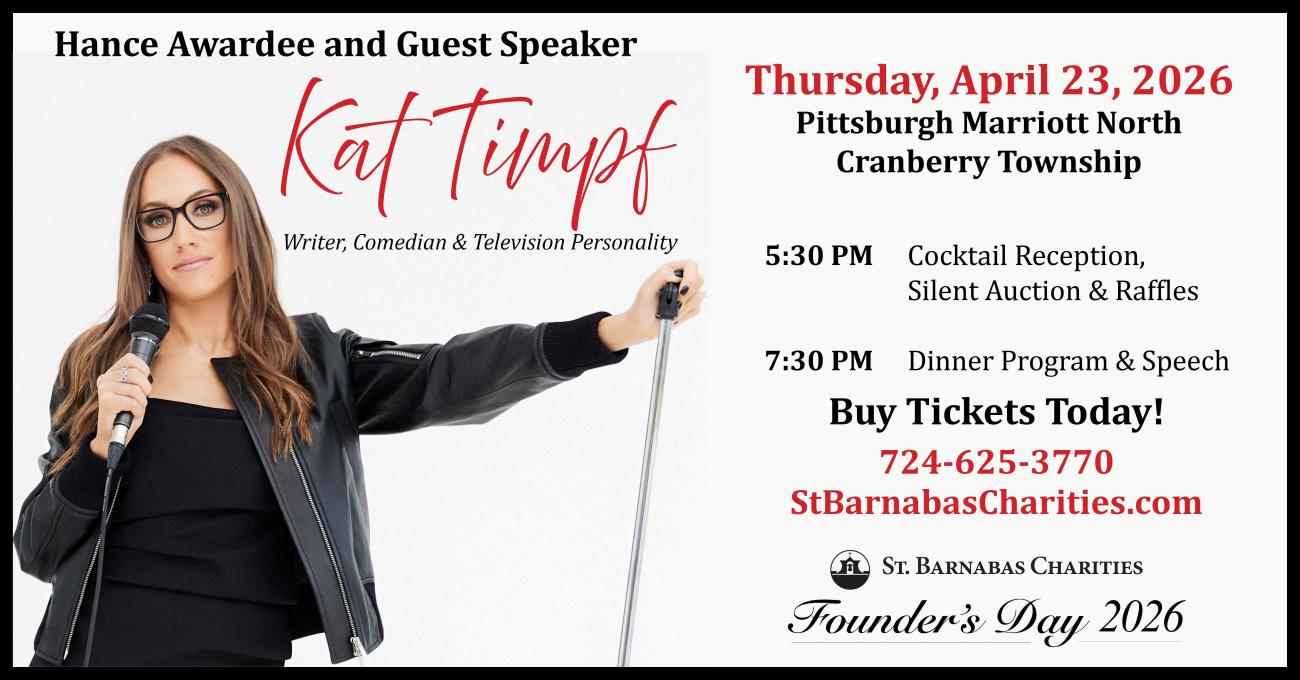 St. Barnabas is excited to announce its 126th Annual Founder's Day Celebration, taking place on Thursday, April 23, 2026, at the Pittsburgh Marriott North in Cranberry Township. The event will begin with a cocktail hour featuring hors d'oeuvres at 5:30 PM, followed by dinner at 7:00 PM. The evening will include a speech by Hence Award recipient Kat Timpf. Additionally, there will be a silent auction, with proceeds benefiting the St. Barnabas Free Care Fund, which supports patients and residents who cannot afford the care they need.